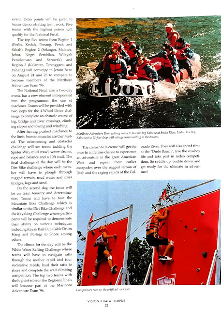 10 Days trip to USA - Over 10 days, the 10 winners will experience the rugged American West covering the wilderness areas of Wyoming, Idaho, Nevada, Arizona and Colorado by raft, dirt bike, horse back and four-wheel drive. The trip is scheduled from Sept.22 to Oct.2. 1994. The Malaysian team members get to test their ability to survive some of the toughest routes in the US which have been described as one of the most beautiful places unspoiled by man.