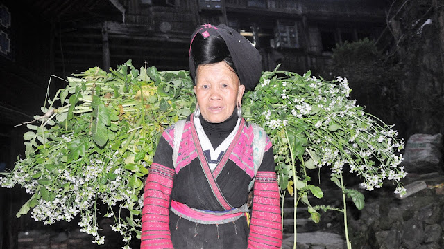 The longhair landlord lady of Dazhai Tavern guesthouse as our porter.