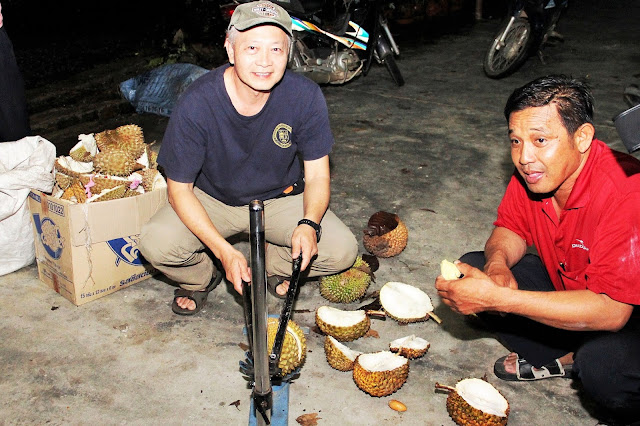 Ching Neng Bin with an improvised durian opener, had been eating more durians after dinner with another friend at Chulabhorn Village 10.
