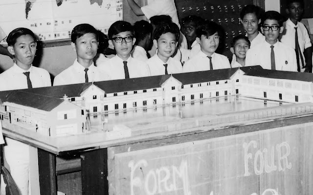 1968 - Form 4Arts - Five classmates took a month to built a model of the school out of cardboard. L-R: Tan Yoke Nuang, Tan Ke Song, Watt Siew Hong, Ching Neng Bin, Cheah Kok Loon.